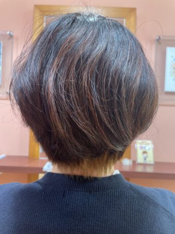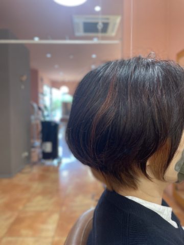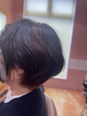 グレイカラーに動きをつけるためにポイントでウィービングを入れたマッシュボブです