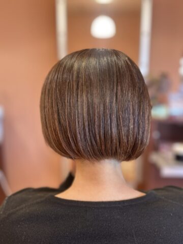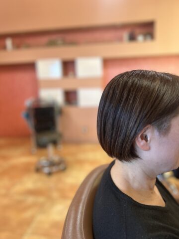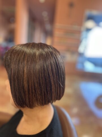 毛量調整のためにサイドと耳したの襟足は3ミリに刈ります。表面は毛先軽めのボブで膨らみを抑えます。カラーはナチュラルブラウンで自然な感じにグレーヘアをカバーしました。