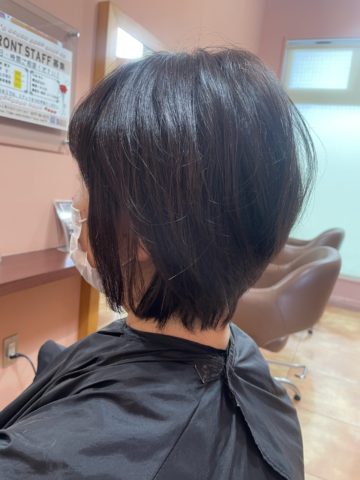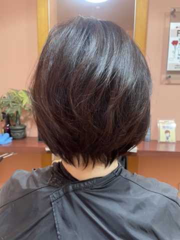 ベースはフェイスラインからネープまでフラットなラインでグラデーションカットとトップにはレイヤーを入れてふんわりとさせました。カラーは7トーンレベルのナチュラルブラウンです。