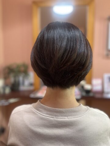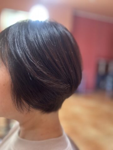 ミディアムAラインのボブからショートグラデーションボブにしたことで襟足がすっきりと。全体の10%くらいのグレーカラーなのでやや明るめ7トーンのナチュラルブラウンて馴染ませました。