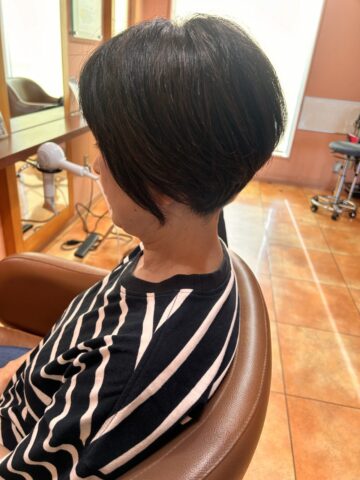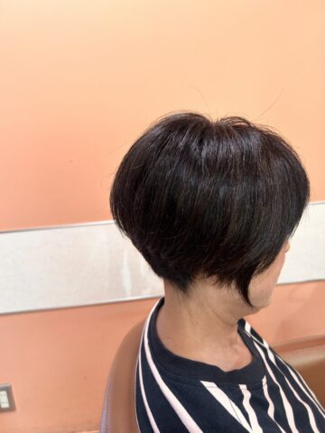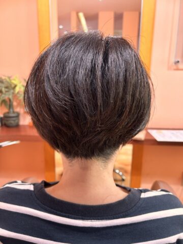 グラデーションボブで襟足はすっきりと刈り上げにしました。もみ上げを少し残してフェイスラインにアクセントをプラス。カラーはグレイヘアを自然な感じにカバーするナチュラルブラウン6トーンです。