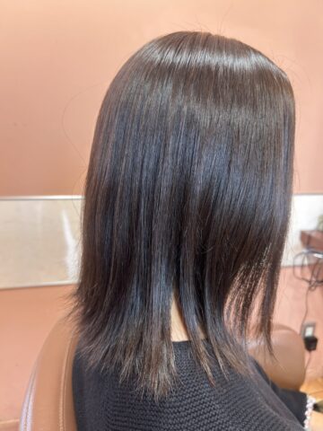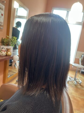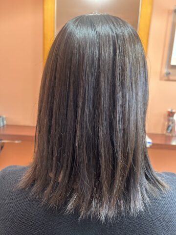 ベースの長を肩より少し長めに毛先は軽くレザーカット。表面の重さを残して内側を中心に軽くしました。