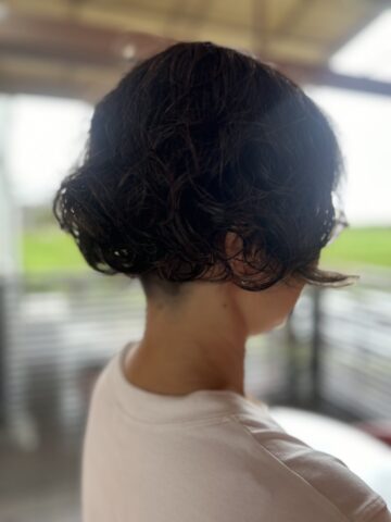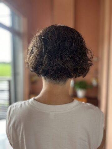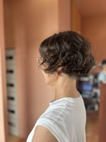 サイドとネープの内側はツーブロックにして毛量を調節してあります。根本からしっかりめにデジタルパーマをかけました。カラーはグレイヘアに自然に馴染ませるトーンのマット系で。