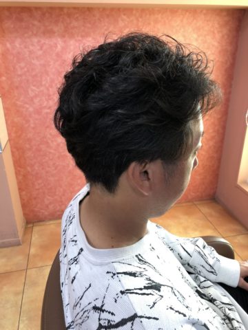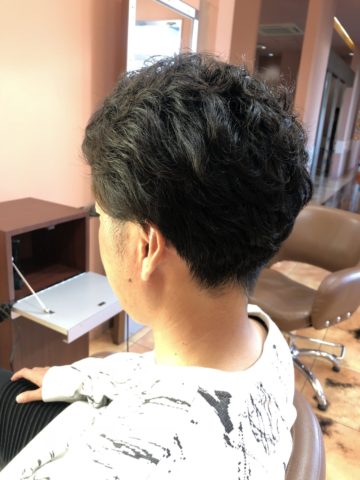 カットはサイドツーブロック、ネープも浅めに刈り上げ。パーマをかけるバングからトップは長めに残したスタイルです。