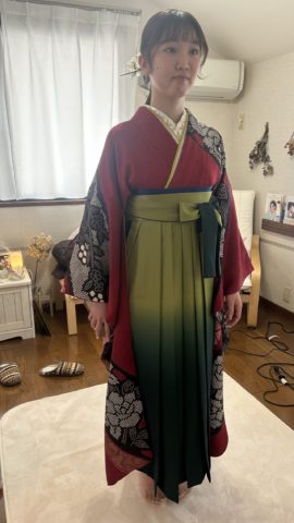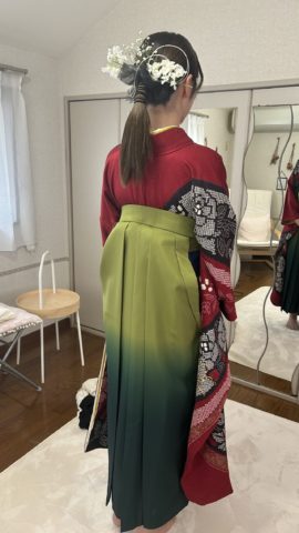 卒業式の袴着付けとヘアアレンジを任せていただきました。ヘアアレンジはキリッとしたローポニーに生花をアレンジしました。