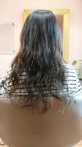 前回のデジタルパーマがまだ残っているので、傷みの出ていた毛先を少し切り、ツヤ感のあるパーマスタイルの維持を提案しました。